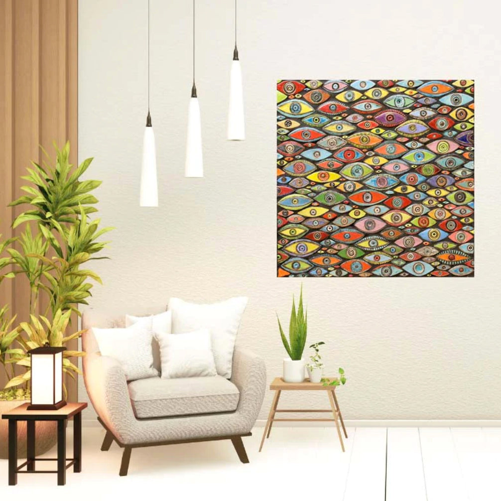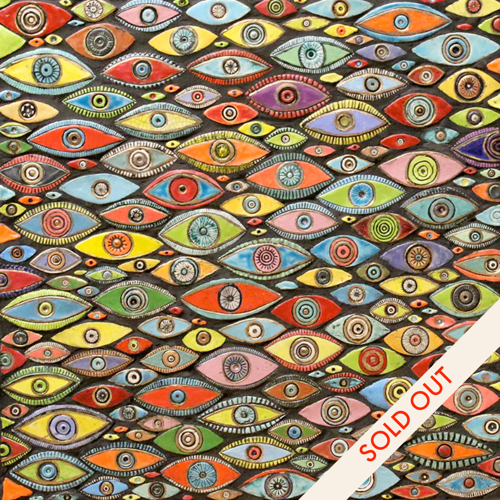 But the diversely colored eyes looking outward directly at the viewer from the piece also speak to a modern interpretation of the eye symbol: the eyes serve as a reminder to us to bear witness. They demand of the viewer that they behold the deep injustices of our society and lend us the strength and moral direction to make right what is wrong. MATERIALS: White Stoneware clay, Lowfire Glazes, Gold luster DIMENSIONS: 24 inches ( 60.96cm ) X 24 inches ( 60.96 cm )