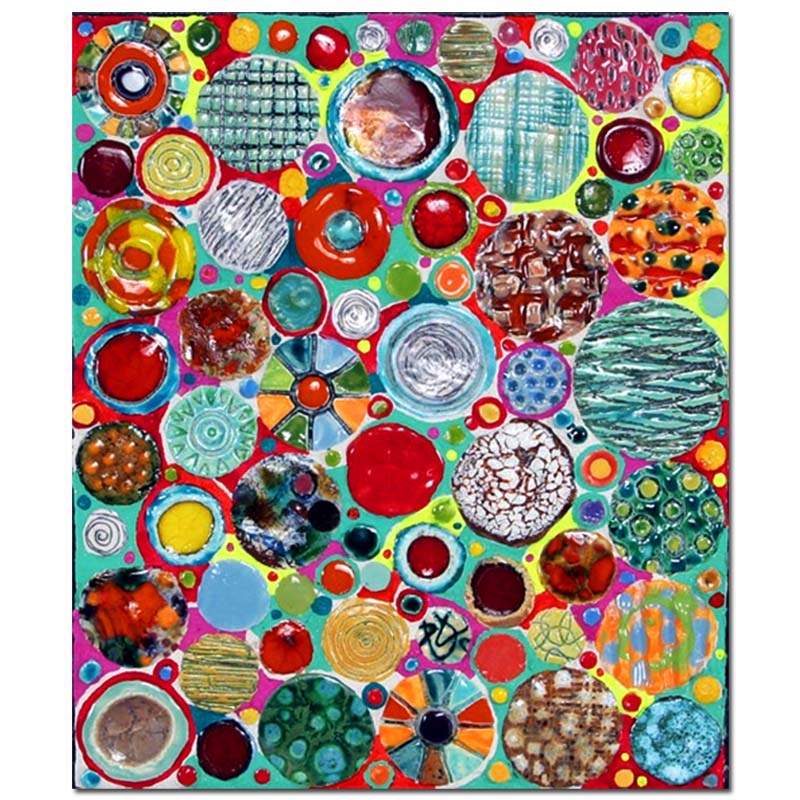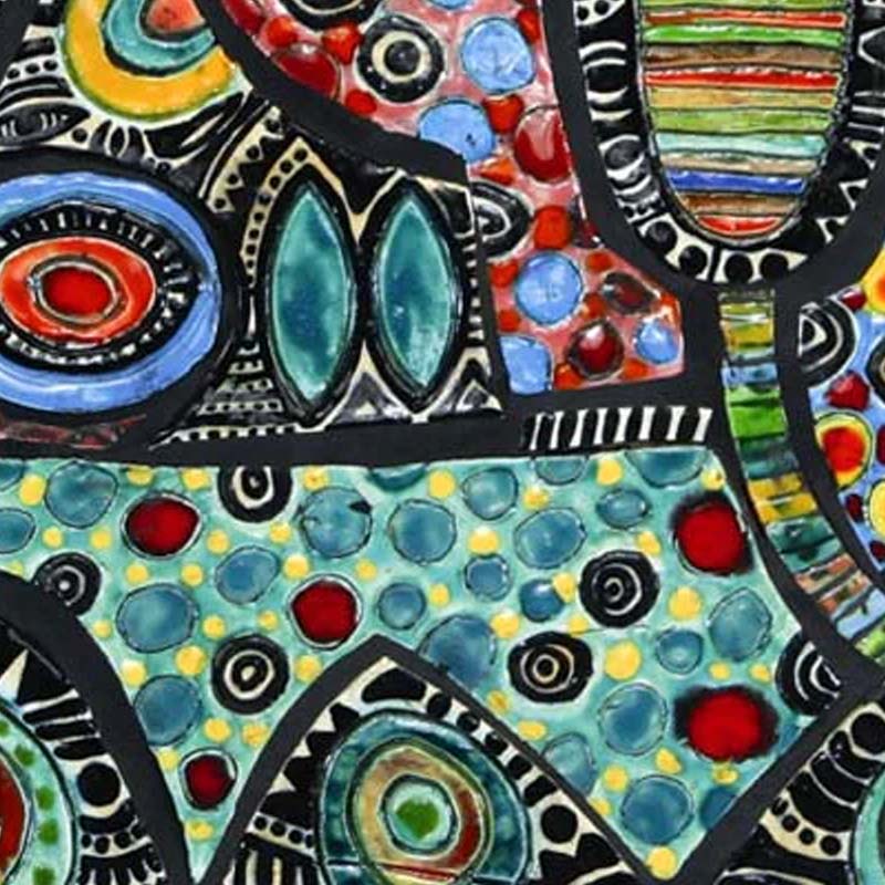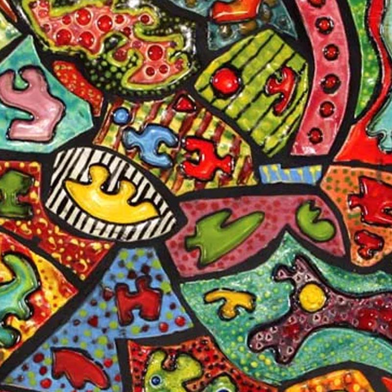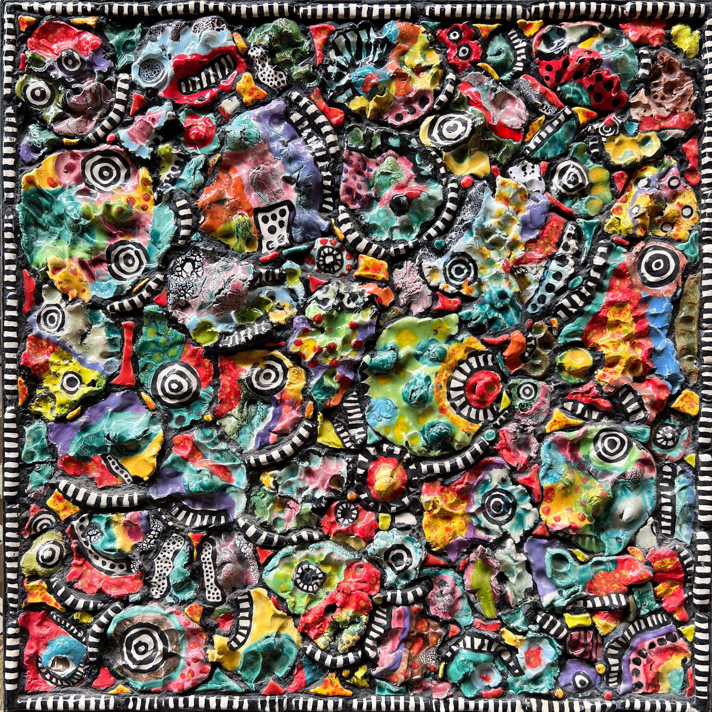 The cell-like shapes in this piece represent the geometry and aesthetics of our tissues and cells, but also the tension between the deep knowledge we have of such structures, and the many mysteries that yet remain. MATERIALS: White Stoneware, Sculpture Clay, Lowfire Glazes, Underglazes & Oxides DIMENSIONS: 20 inches ( 50.8 cm ) X 20 inches ( 50.8 cm )