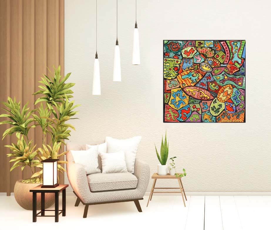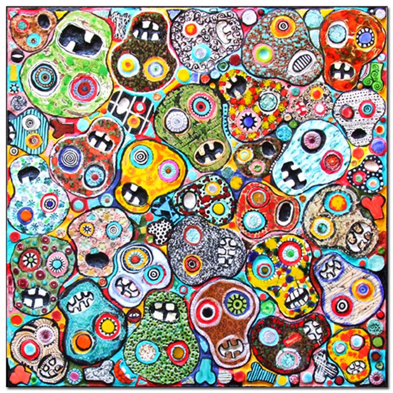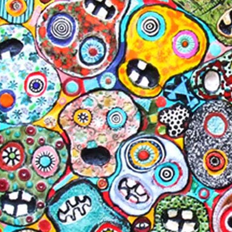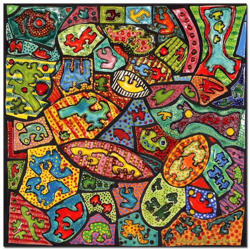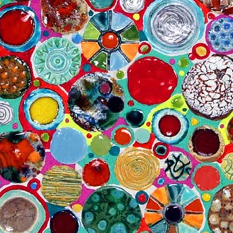 The cell-like shapes in this piece represent the geometry and aesthetics of our tissues and cells, but also the tension between the deep knowledge we have of such structures, and the many mysteries that yet remain. MATERIALS: White Stoneware, Sculpture Clay, Lowfire Glazes, Underglazes & Oxides DIMENSIONS: 20 inches ( 50.8 cm ) X 20 inches ( 50.8 cm )