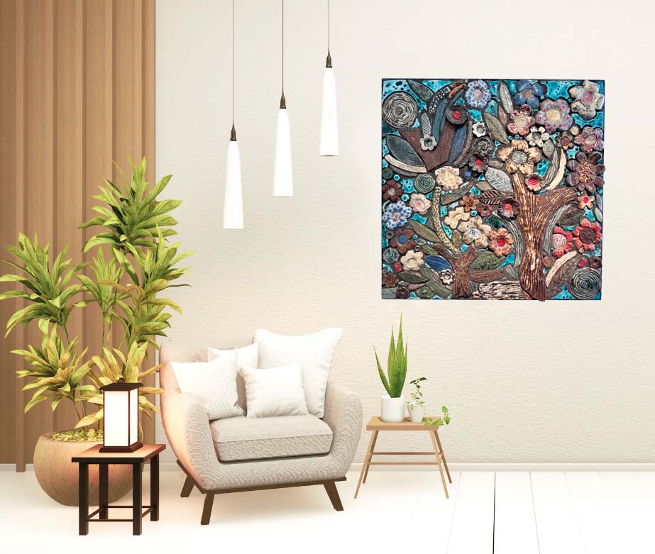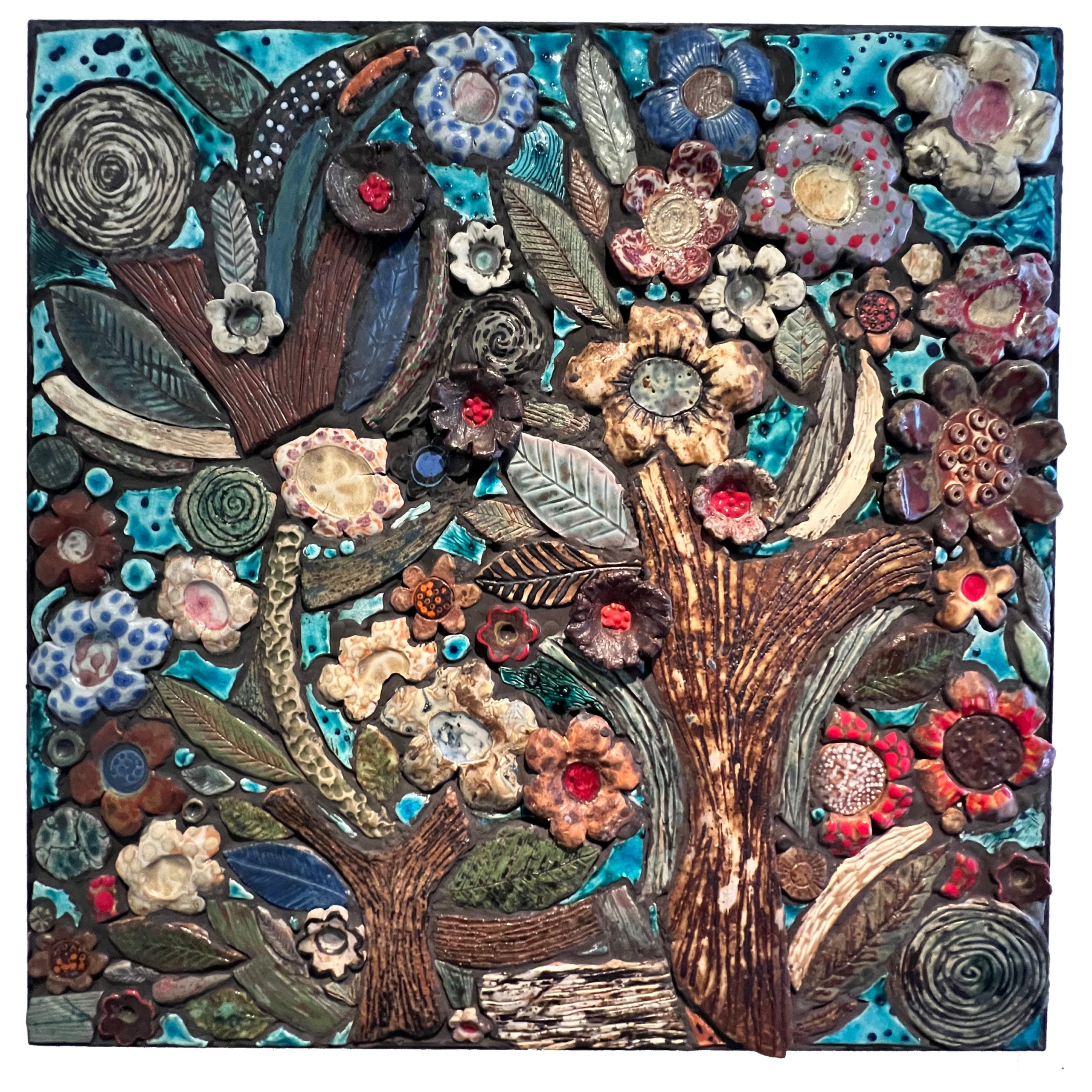 The rich and varied plants in this earth-toned motif speak to the colors and patterns of the desert climates that make up much of the middle east. Despite the aridity, these ecosystems are rich with diverse plant and animal life. Looking closely at the landscape, one begins to appreciate the stimulating shapes and colors that make up these landscapes. MATERIALS: White Stoneware, Sculpture Clay, Lowfire Glazes, Underglazes & Oxides DIMENSIONS: 23 inches X 24 inches
