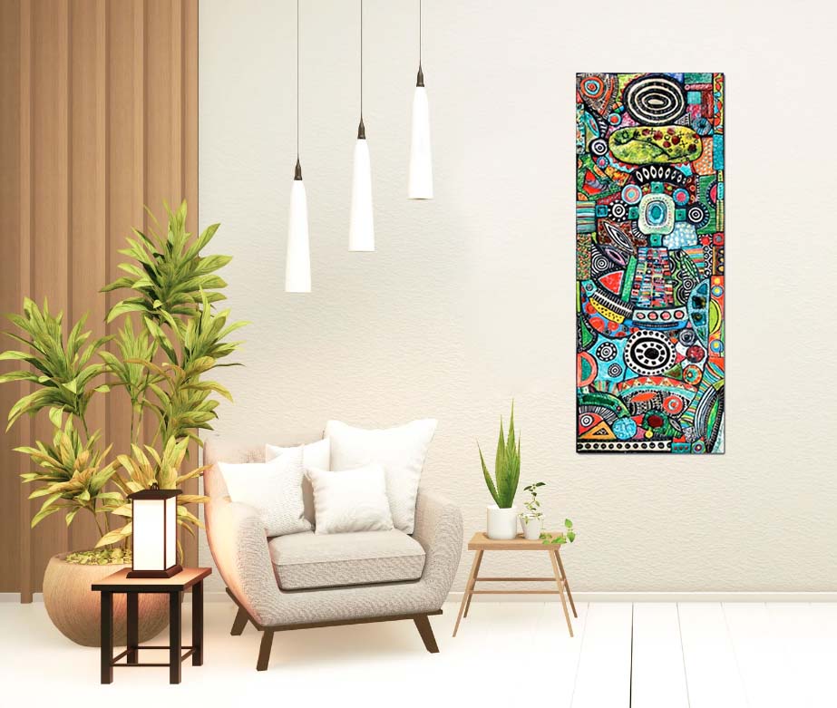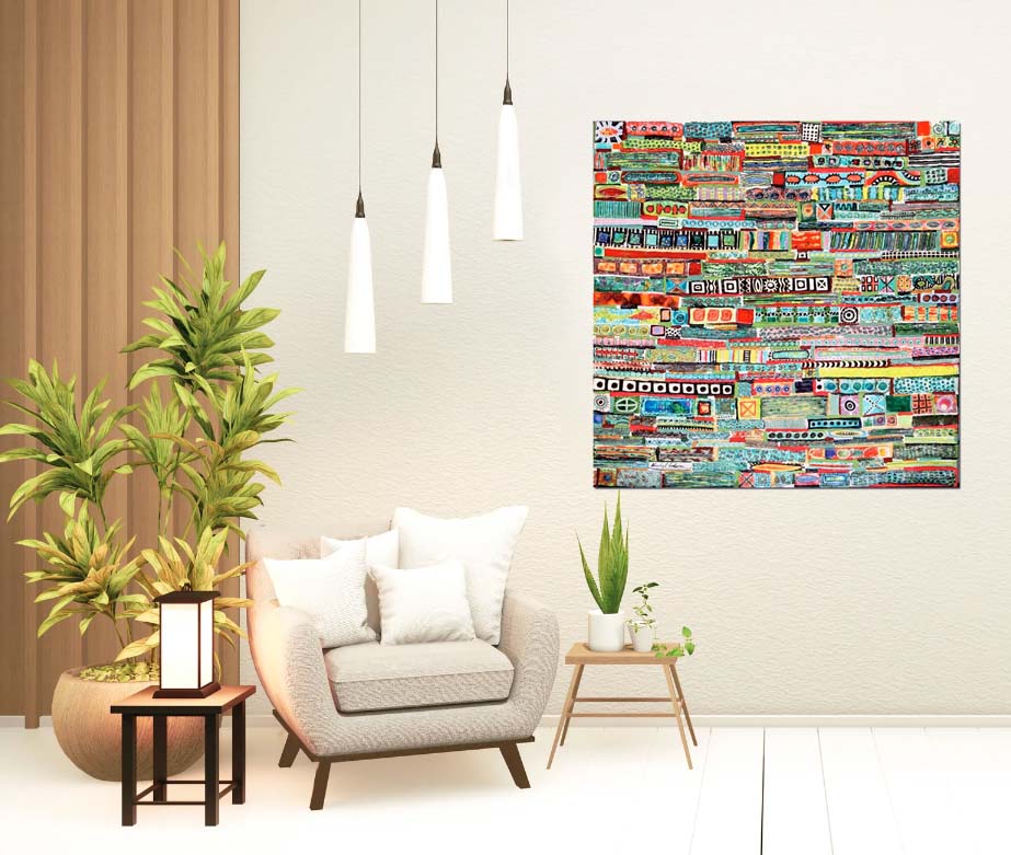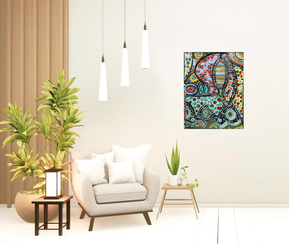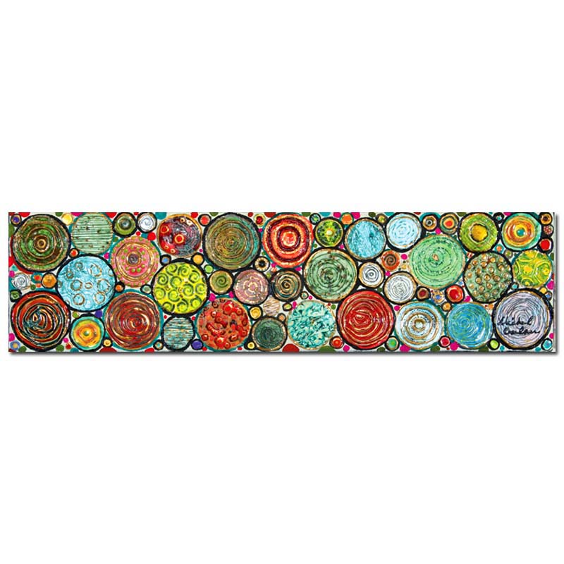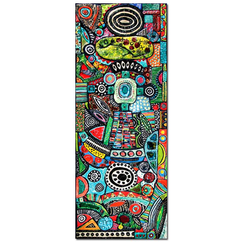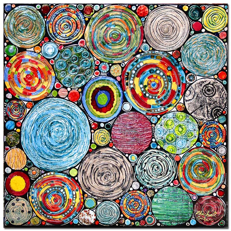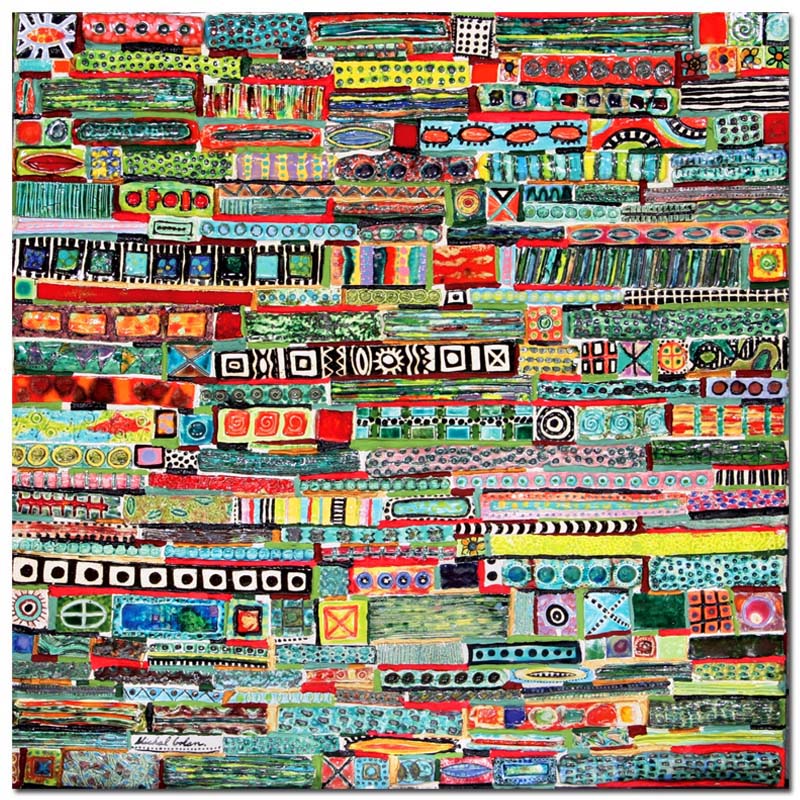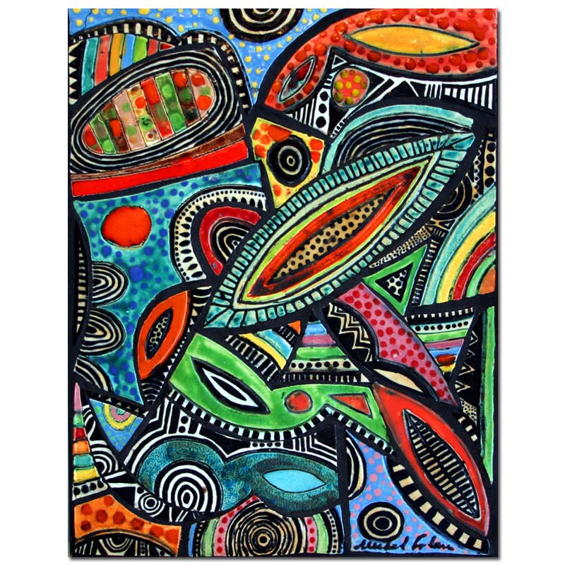 This is a tribute to the beauty of Israel and its geographic and cultural diversity. The mountains at the bottom are contrasted with the yellow deserts, blue seas, and colorful forests. Despite this beauty, there is a foreboding to this piece; the landscape is interpolated by circles of conflict like a pox on the land. Read More