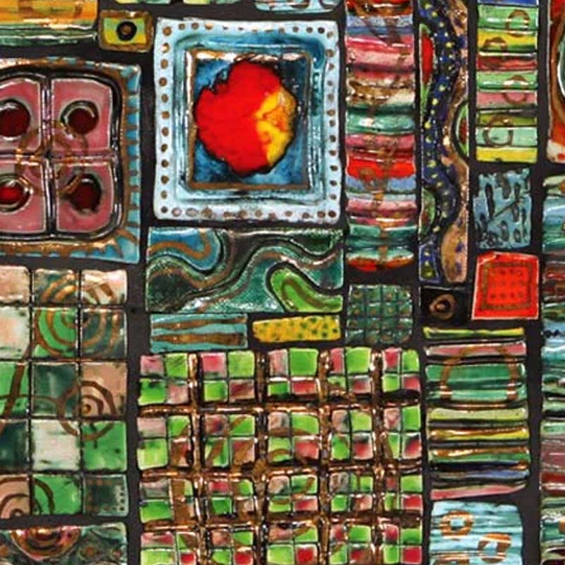 My own art seeks to use our collective memory—symbolic memory, aesthetic memory, historical memory—as a means of celebrating and reconnecting to the past in the context of our present lives. MATERIALS: White Stoneware, Sculpture Clay, Lowfire Glazes & Oxides DIMENSIONS: 30 inches ( 76.2 cm ) X 30 inches ( 76.2 cm )