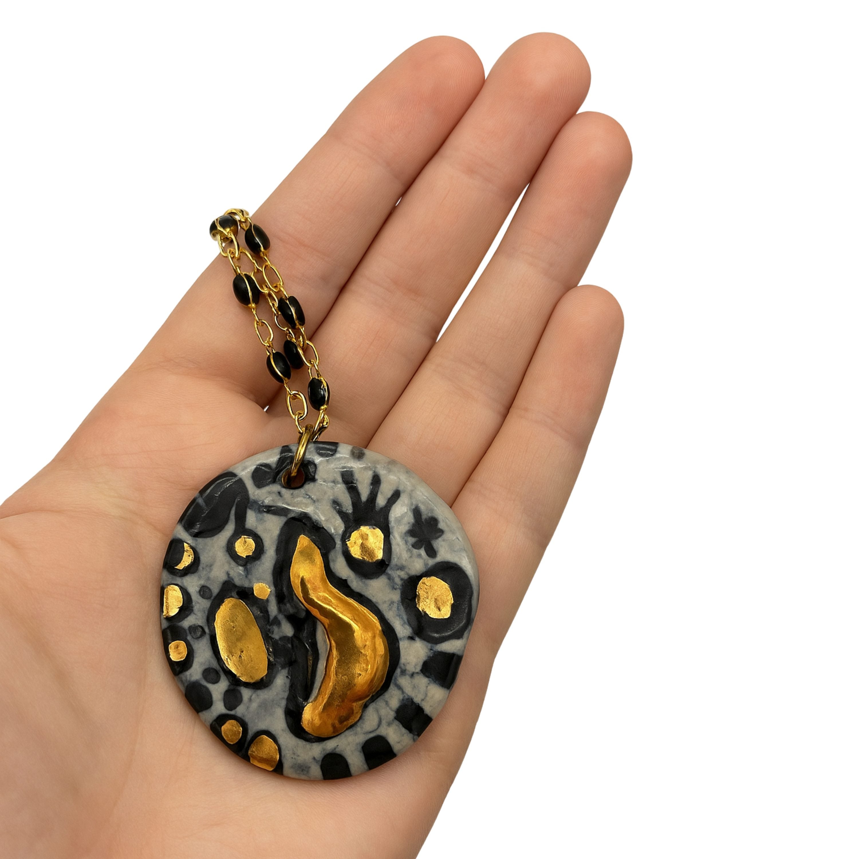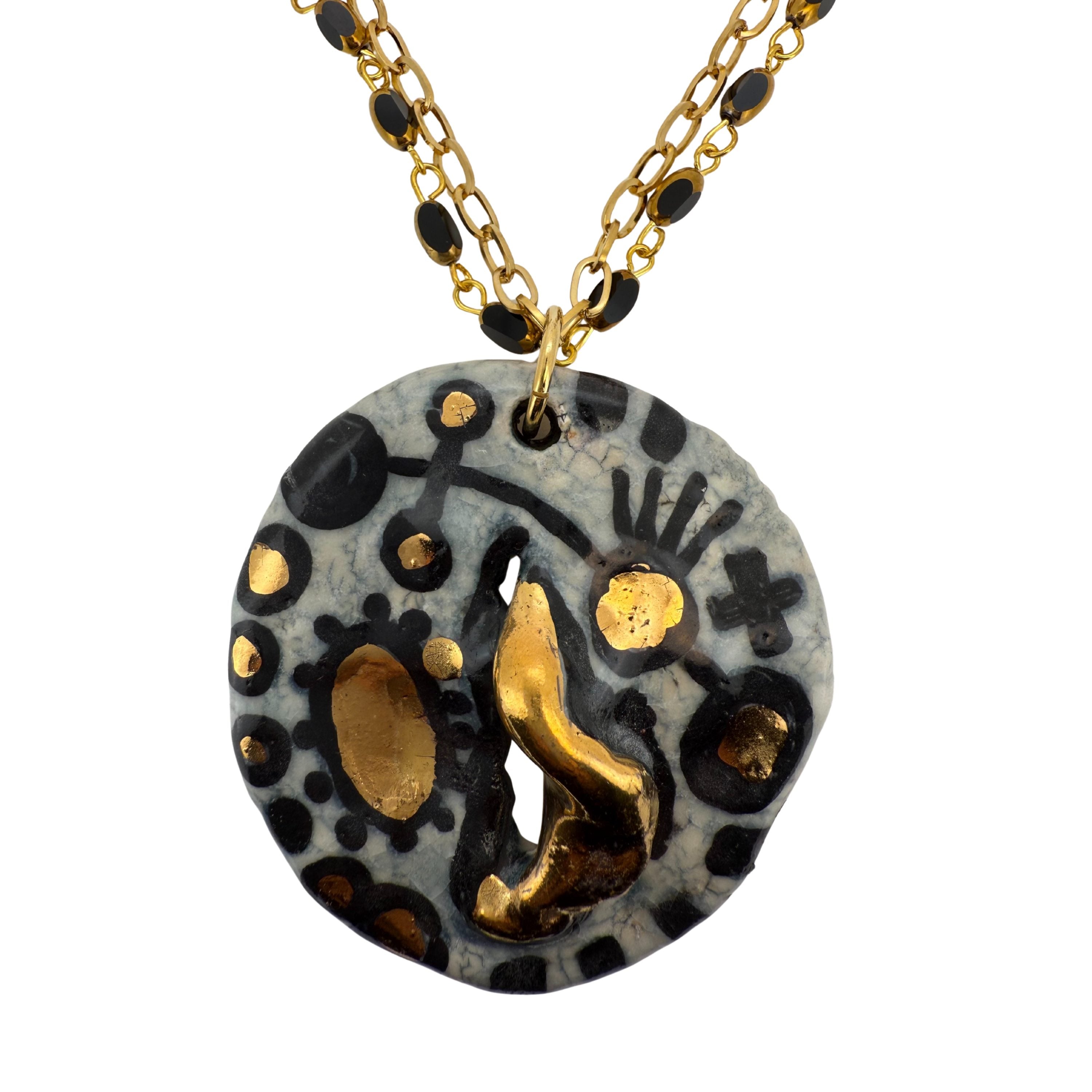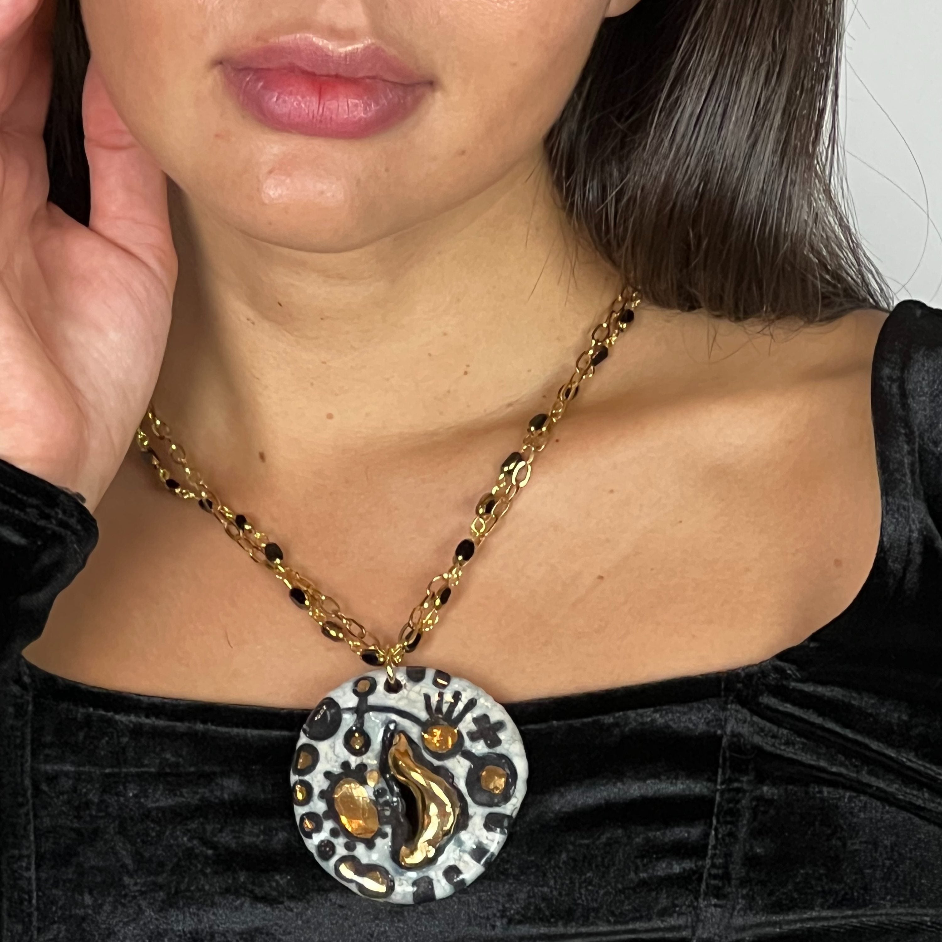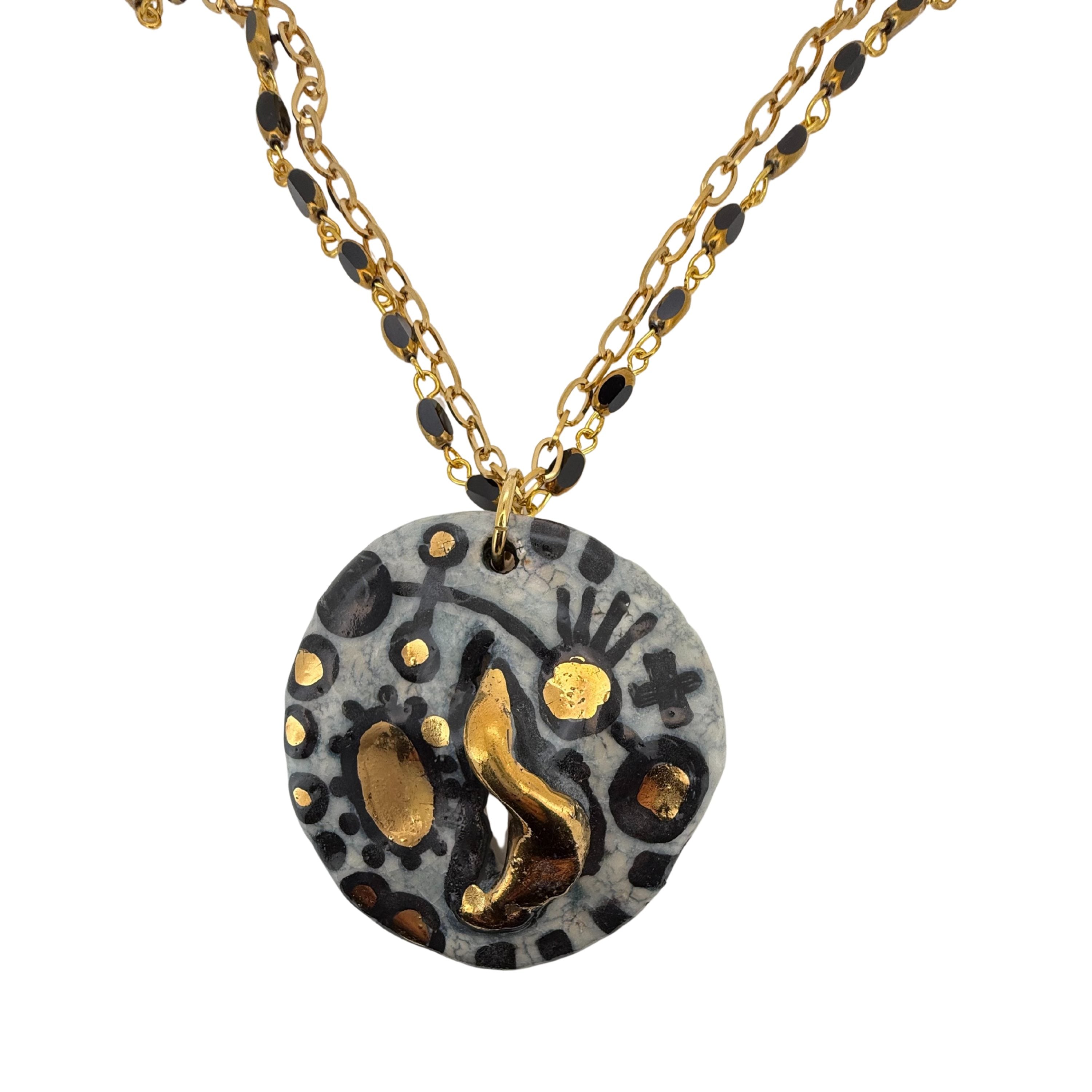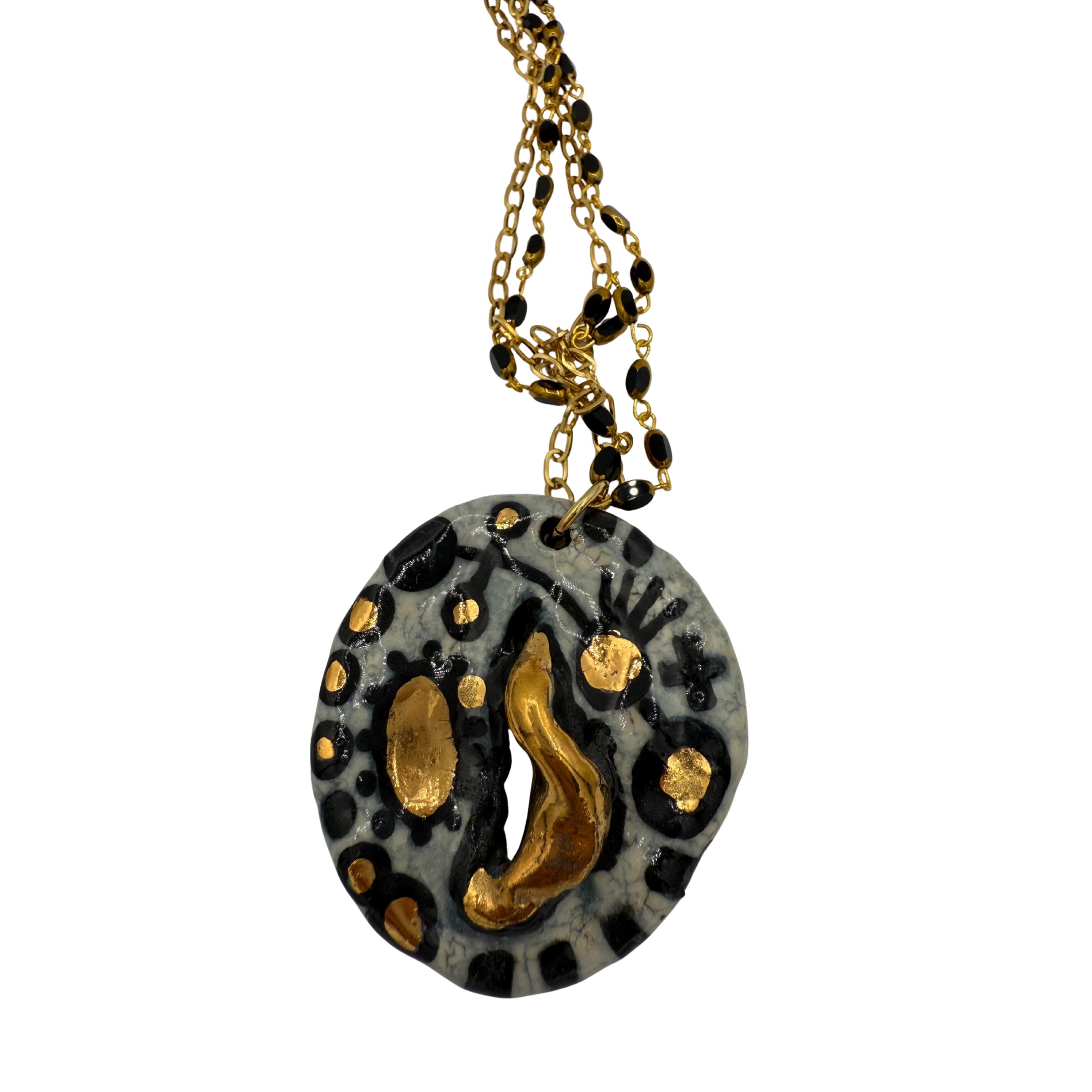 Materials: White stoneware pendant with gold luster, 24k gold-plated chain with glass beads