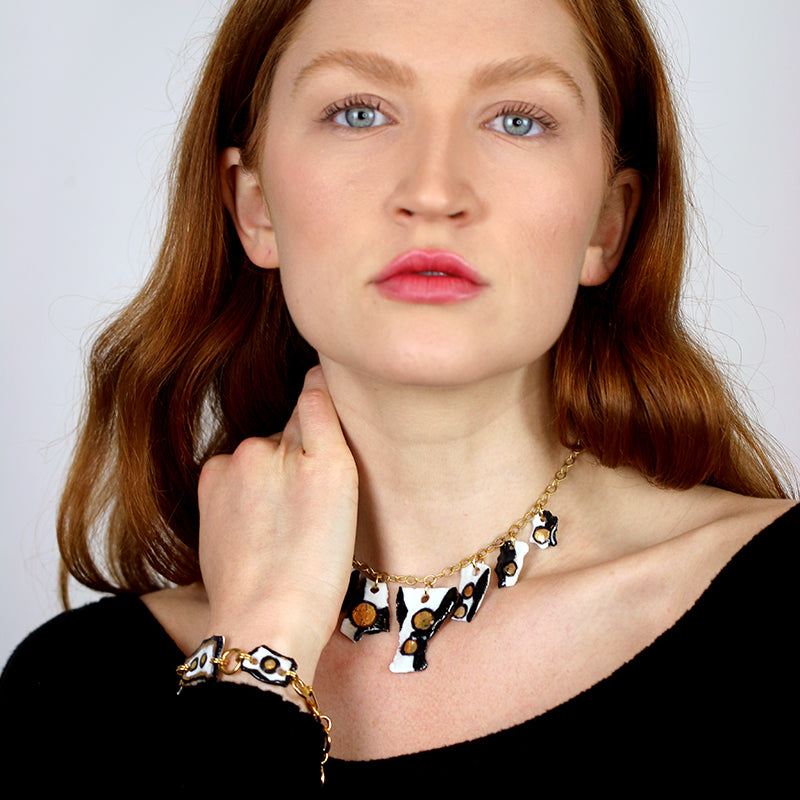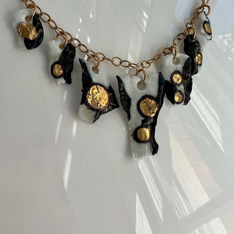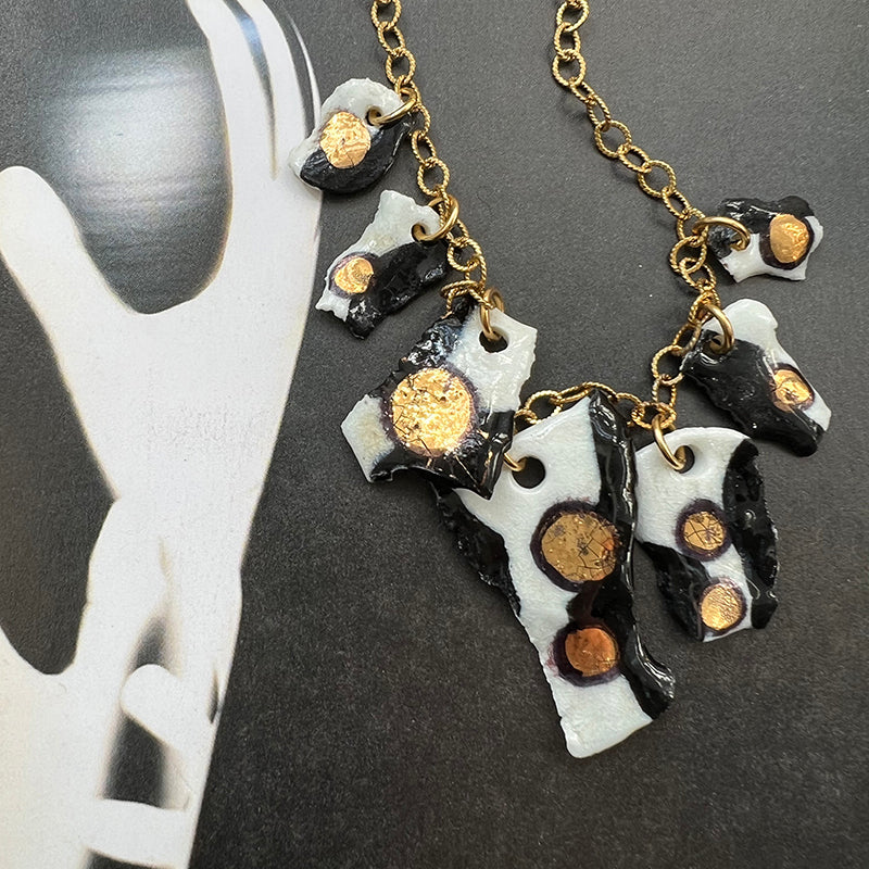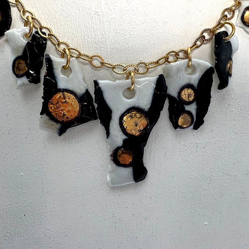 Materials: Porcelain with black glaze and gold luster, brass electroplated with 24k gold