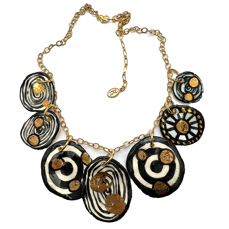 Materials: Porcelain with black glaze and gold luster, brass electroplated with 24k gold