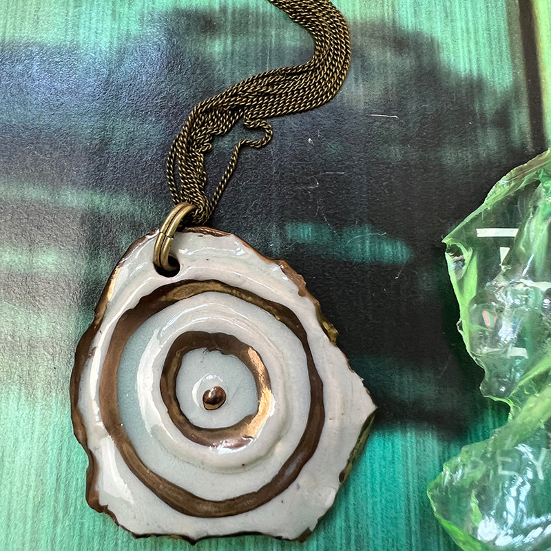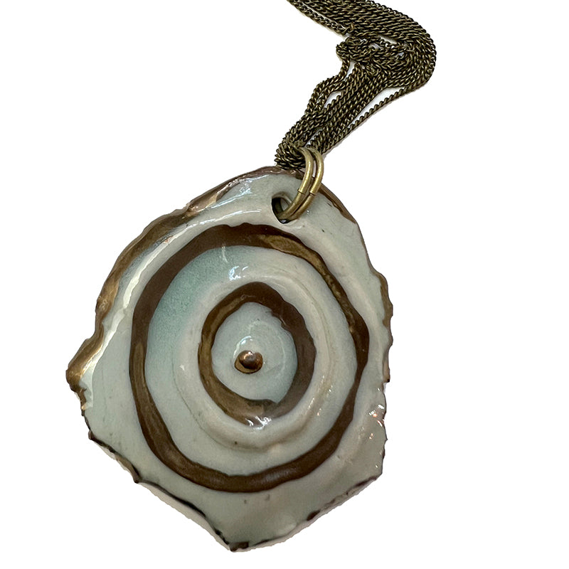 Materials: White stoneware clay, celadon glaze, gold luster, brass electroplated with 24k gold
