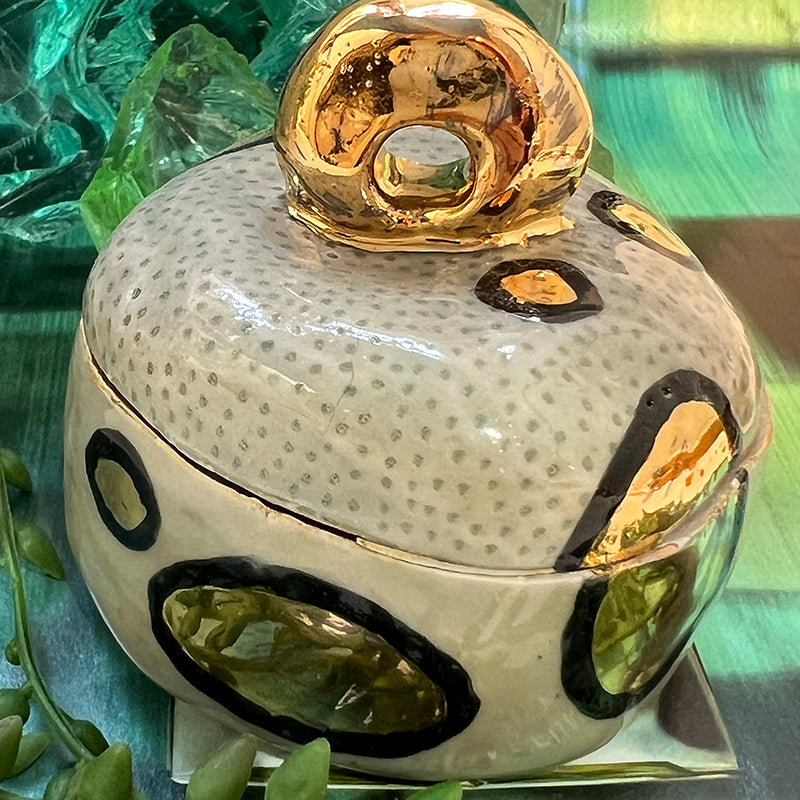 Materials: White stoneware clay, high and low fire glazes, gold luster