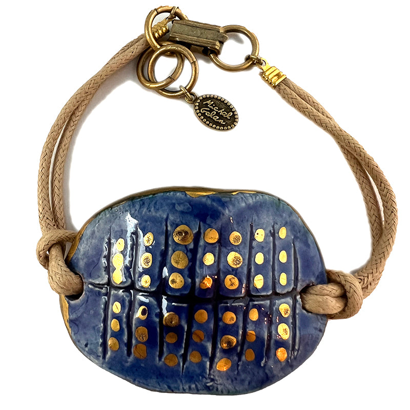 Materials: White stoneware clay, blue glaze, gold luster, cotton cord, brass electroplated with 24k gold