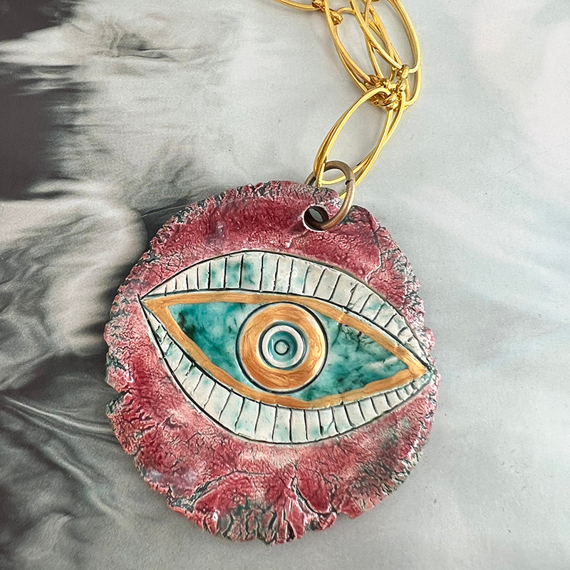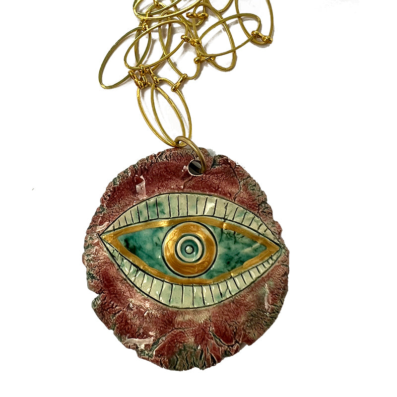 Materials: White stoneware clay glazed with low fire glazes, brass electroplated with 24k gold