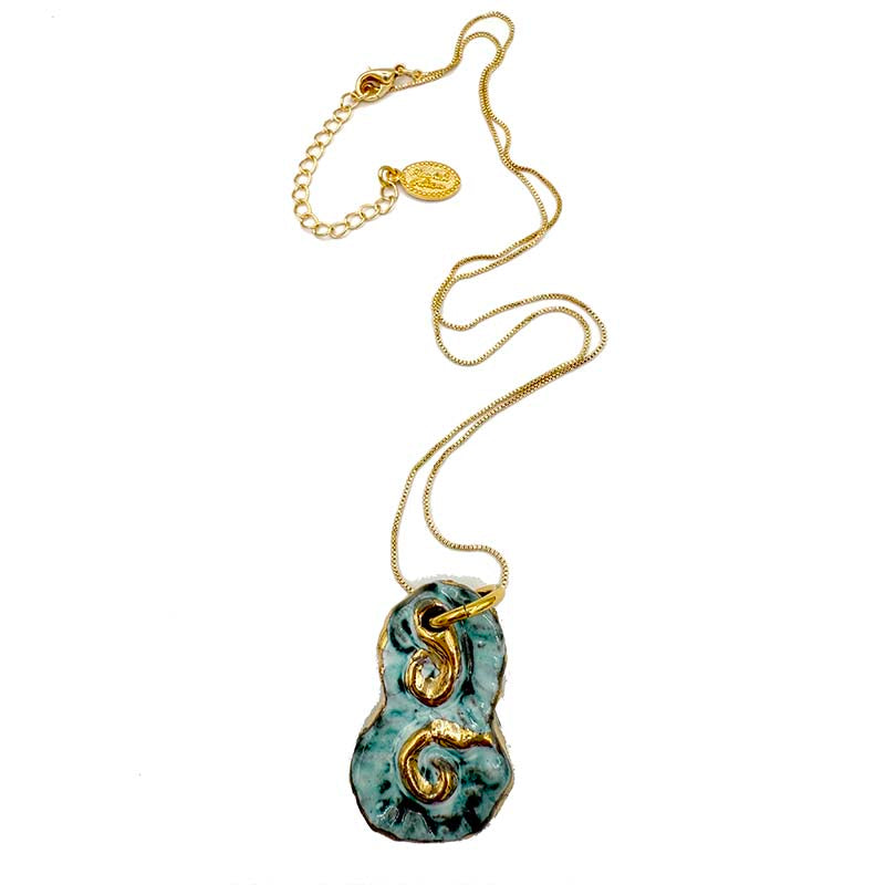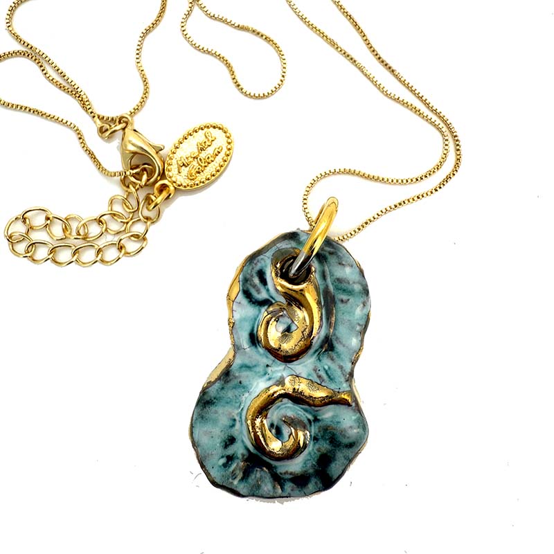 Materials: High fire sculpture clay pendent with gold luster, 24k gold plated chain