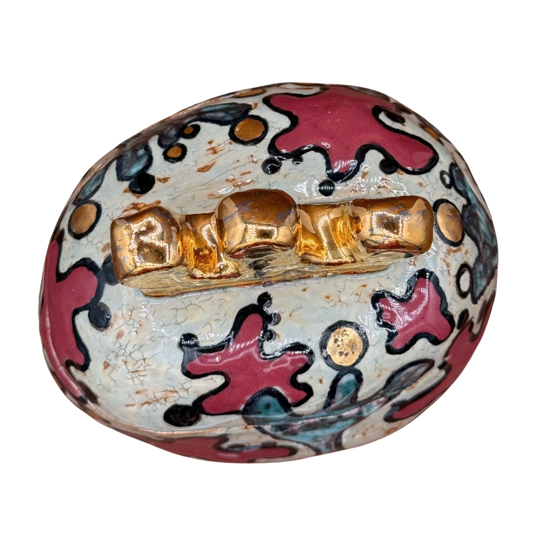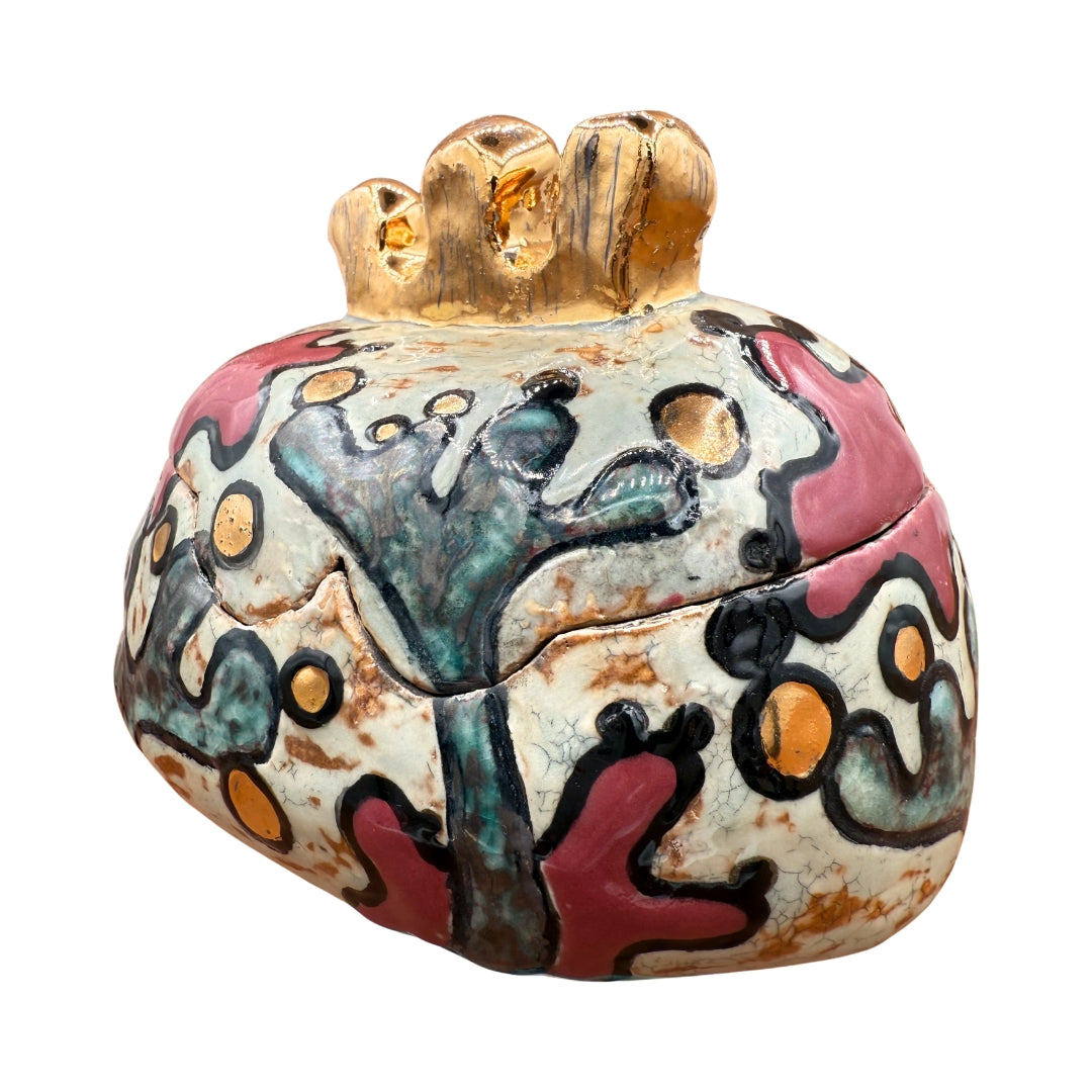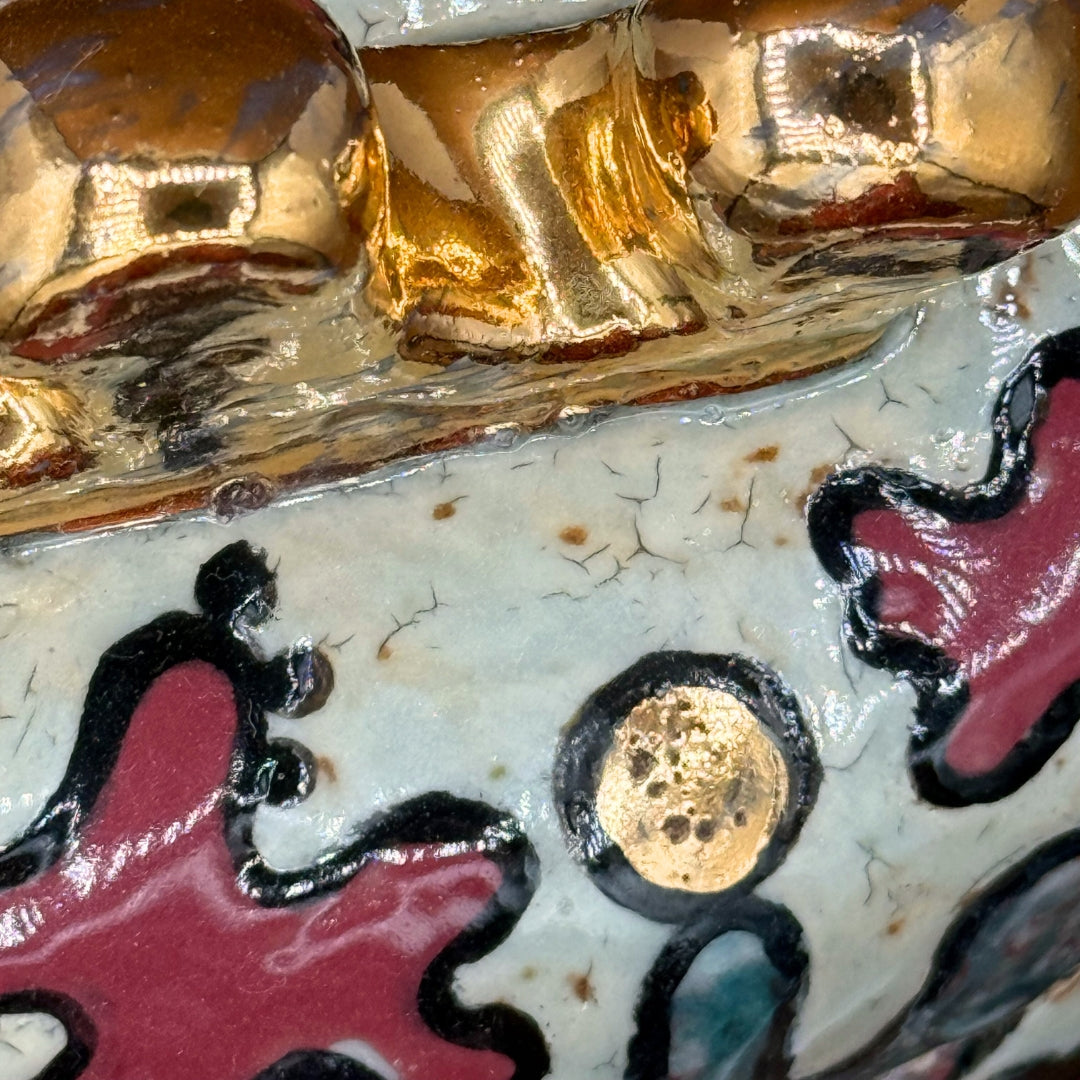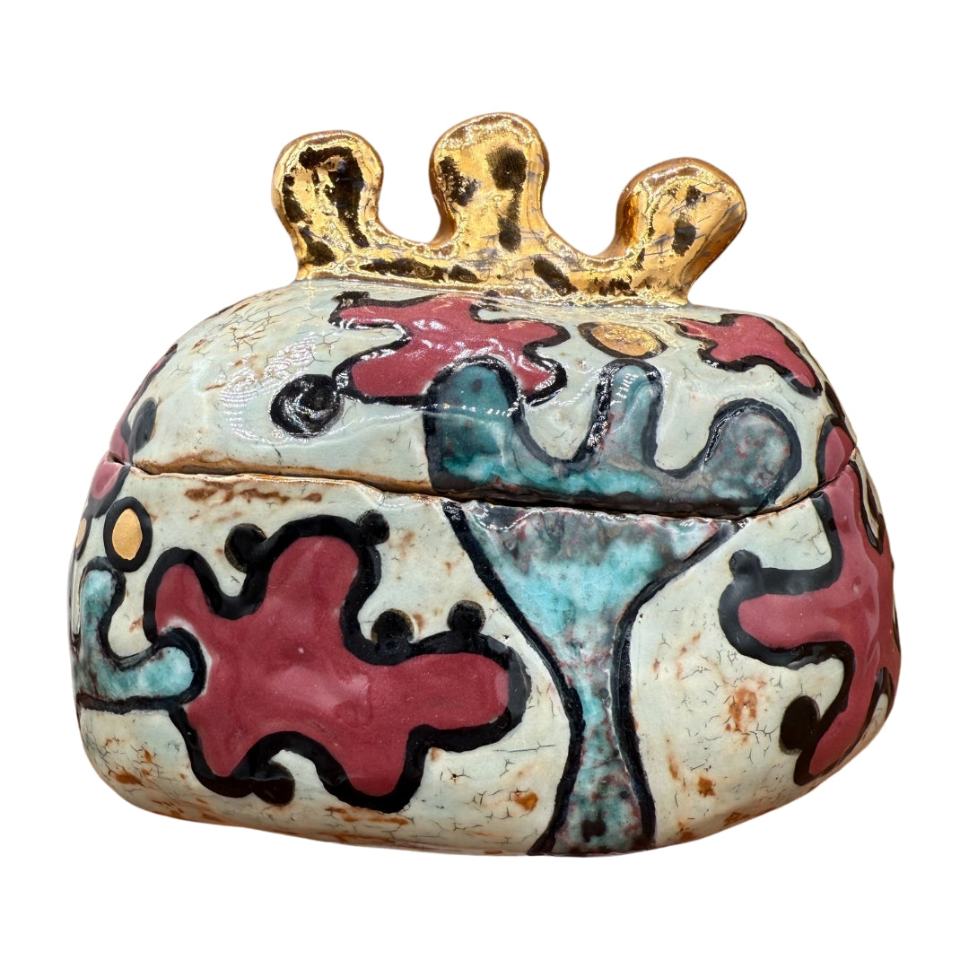 Material: white stoneware clay with high fire, low fire glazes oxides and gold luster One of a kind handmade ceramic box