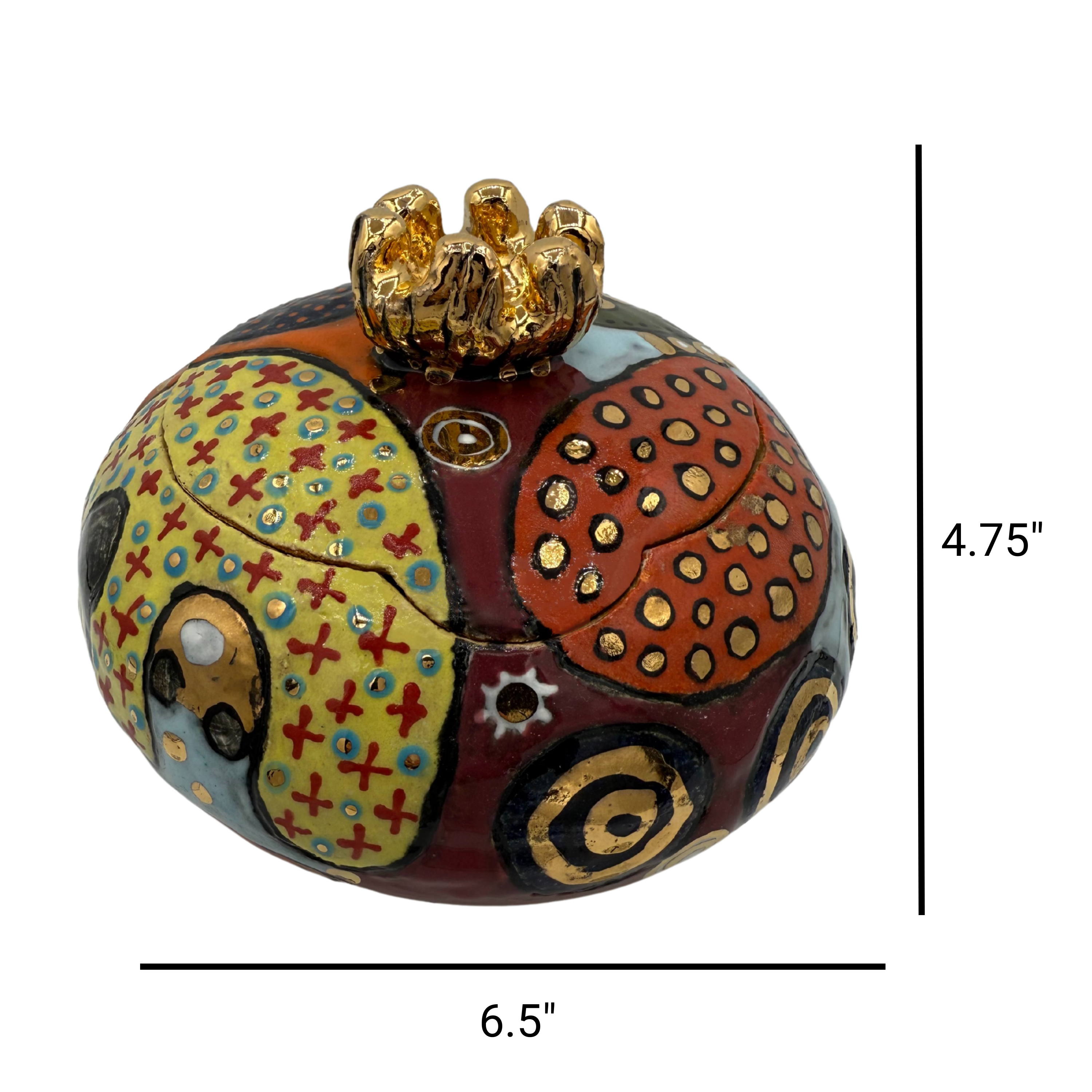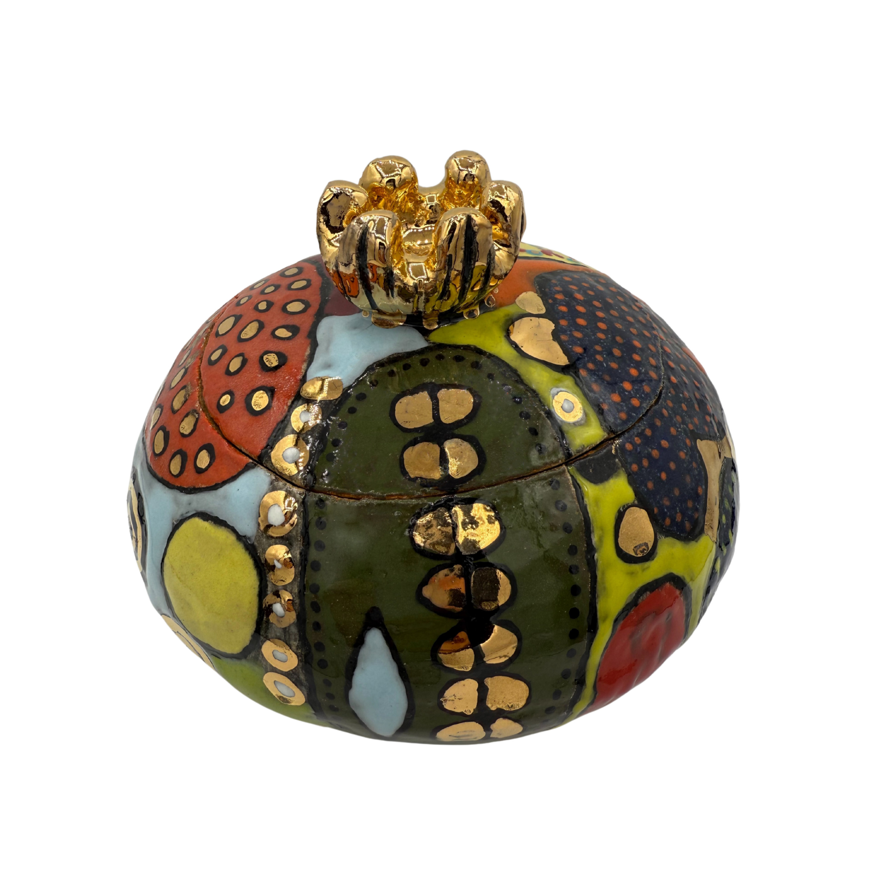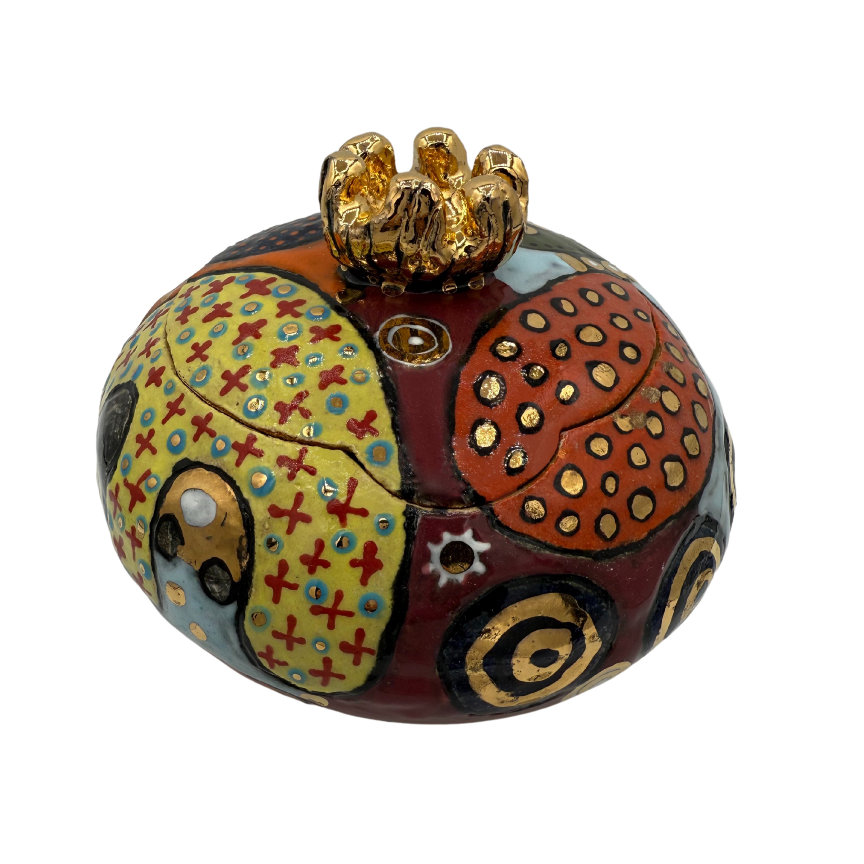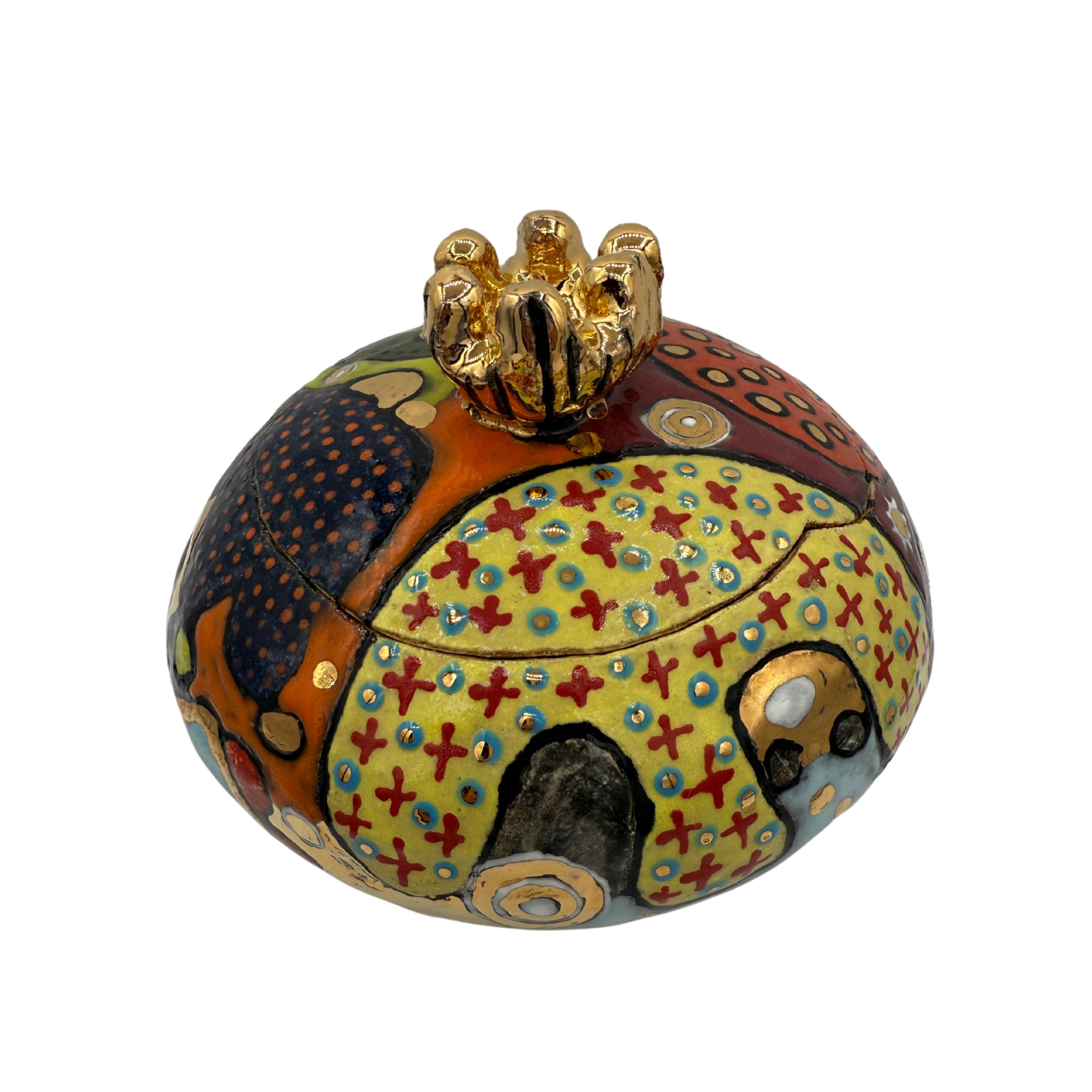 Material: sculpture clay high fired with high and low fired glazes ,underglazes and gold luster